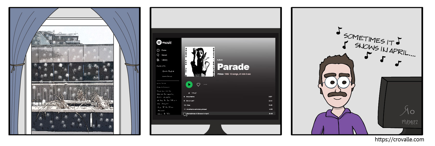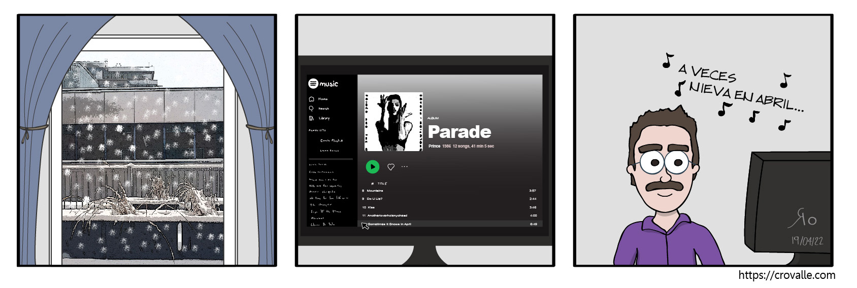 más o menos mucho #240 20/04/202225/04/2022 | cro Ya es tradición escuchar esa canción de Prince porque de la misma manera, cada año nos ha nevado en Abril. cro Share this: Click to share on X (Opens in new window) X Click to share on Facebook (Opens in new window) Facebook Like Loading... Related